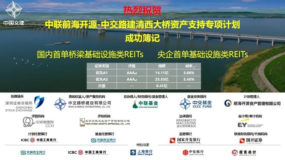 6月9日,中交集团所属中交路建在深交所成功簿记发行“中联前海开源-中交路建清西大桥资产支持专项计划”(以下简称“类REITs”),发行规模47.05亿元,产品期限约24年(2N+1),优先级最低发行票面利率3.48%。该产品是国内首单桥梁基础设施类REITs、央企首单基础设施类REITs。