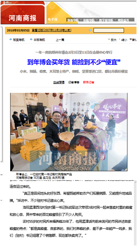 洛阳孟津西沟村驻村第一书记张战军这次带领3名村民一起来售卖村里的蜂蜜和救心茶,其中带来的百花蜂蜜吸引了不少人购买。