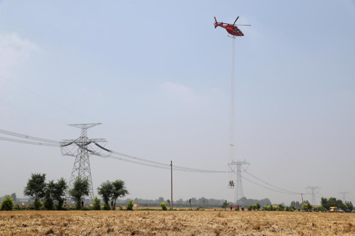 6月18日上午,在河北省邯郸市临漳县境内,国家电网有限公司员工对内蒙古~山东±800千伏线路(昭沂线)开展了直升机吊篮法带电消缺。经过1个小时作业,成功消除线路缺陷。这是世界上首次利用直升机对特高压直流线路进行带电作业,标志着我国带电作业技术和实践再次取得突破。