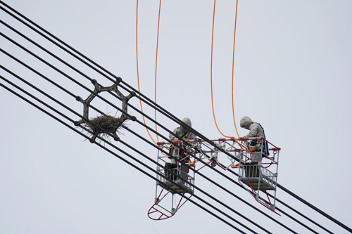 “当前风速1.5米/秒,湿度40%,可以开展作业!”当日上午11时21分,一架双发轻型直升机用吊篮搭载着检修人员缓缓升空,慢慢靠近特高压线路,将吊篮精准放置在作业位置。伴随着引流棒与导线拉出的一道耀眼电弧,国网河北电力、国网通航公司员工进入电场,进行等电位带电消缺。他们聚精会神操作,确认位置、更换销钉、摘除鸟窝……一小时后线路缺陷成功消除。