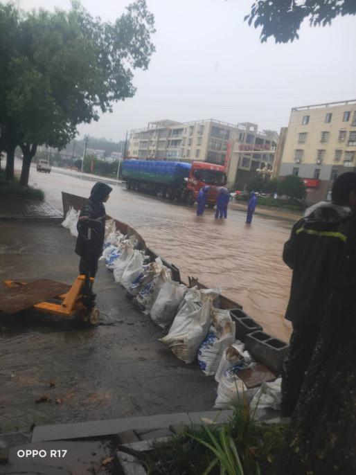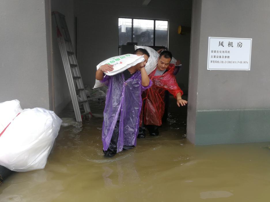 7月8日上午9时,江西武宁工业污水处理厂所在的武宁万福工业园区突然出现街道漫水情况,水位明显上涨较快,在经过观察巡视后发现洪水流入了园区污泥暂存废弃厂房内。武宁水厂第一时间组织全厂人员协助当地政府进行抗洪抗灾工作,不让洪水将污泥带走,造成污染。在大雨中,全厂员工分成3组,2人一组,将泥土装入编织袋,将废弃厂房大门口严严实实堵住,抵御住了洪水的大量流入,成功抵御住了洪水的漫入。