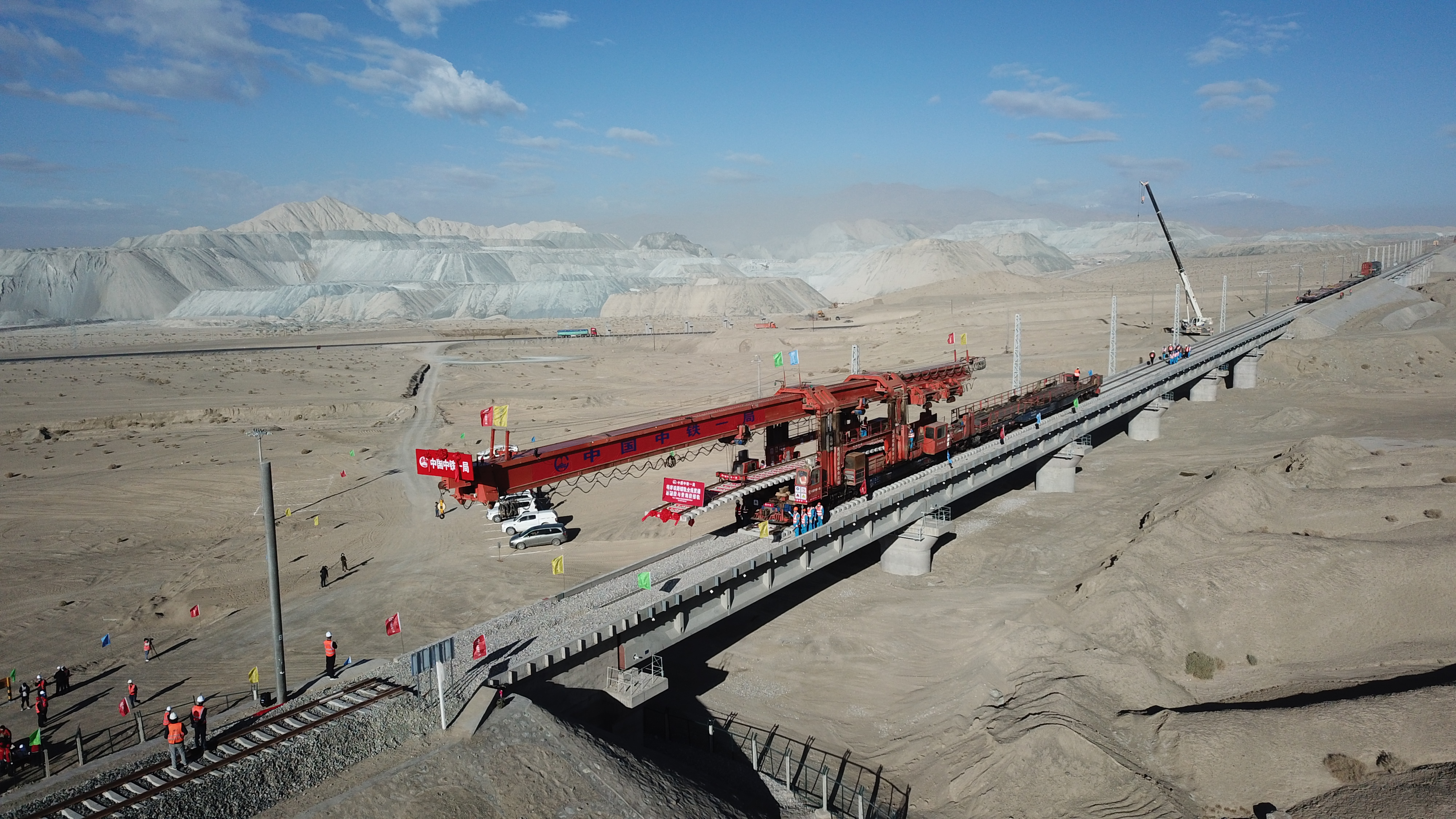 据了解,在格库铁路台特玛湖特大桥(长24.558公里,新疆段最长铁路桥)架设过程中,中铁一局格库铁路铺架项目部技术人员经过科研攻关,设计制造了桥梁倒装龙门架底盘,缩短了该桥架梁工期3个月。尤其在2020年受疫情影响铺架进度滞后的情况下,项目部闻令而动,以“点对点”包机的方式组织员工在标段内率先返岗复工,仅用4个月的时间,完成了后续长大坡道、桥隧相连地段铺轨73.11公里,架梁254孔的铺架任务,创造了架桥机日铺轨1.7公里的高原铁路铺轨纪录。