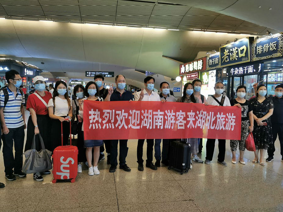 7月20日下午,G552次列车停靠武汉站,来自湖南省一行8人的旅行团到达江城武汉。湖北省文旅厅相关负责人、中国旅游集团武汉国旅负责人及相关工作人员在出站口迎接湖北省首个跨省游团队,也是武汉市的首个外省团队。
