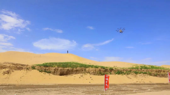乌梁素海项目飞播造林工程面积1万余亩,相当于1000个足球场,且处于干旱的沙漠地区,对于无人机的功能、种子的选择、气象条件等要求非常严苛。项目生产经理任小龙带领项目生产团队,对无人机播种的可行性进行深入研究,为无人机安装了播撒口,并根据飞行高度,计算播撒角度,对播撒口进行切割打磨,达到设计飞播要求参数。项目团队历经三天四夜的连续攻关,完成了用无人机播种的准备工作,经过一周的等待,终于接到气象部门通知,未来几天,风力符合飞播要求。项目部立刻制定飞播造林工作方案,5台大疆植保MG-1P无人机,飞播手、地勤装料、后勤电力供给部门互相配合,24小时不间断飞播作业,利用5个昼夜,1500个飞行架次,完成万亩沙地飞播撒种,向万亩沙漠抛撒下绿色的希望。