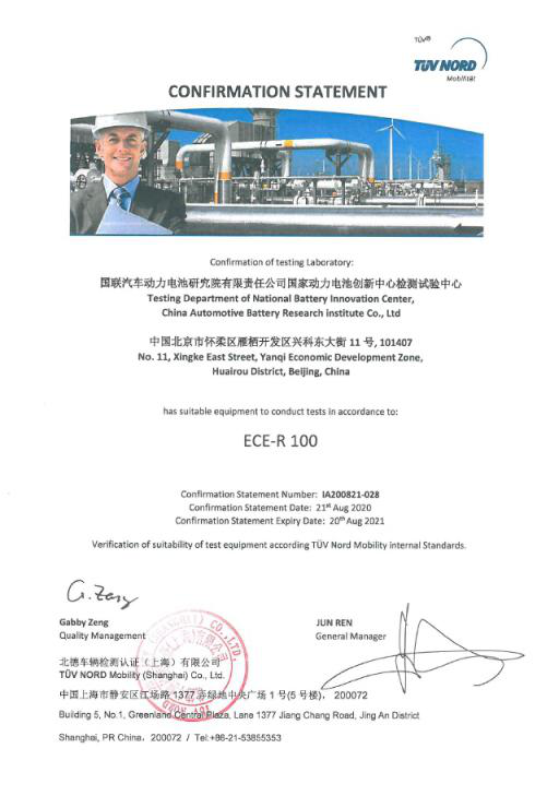 8月26日,德国TÜV北德认证机构正式为有研集团国联汽车动力电池研究院有限责任公司国家动力电池创新中心检测试验中心发放了ECE-R100检测能力授权证书。