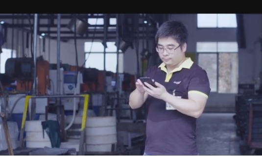 阳江刀具制造企业水磨车间主任洪杏爽正在使用中国联通“云镝智慧工业互联网平台”查看企业生产记录