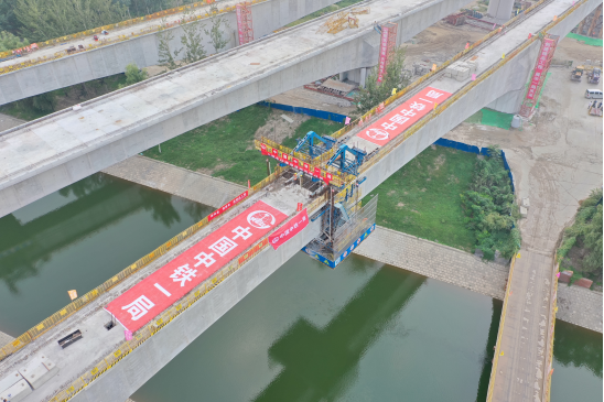 京滨铁路宝坻特大桥跨引滦明渠连续梁全长272米,其中主跨长度128米,左幅合龙段混凝土设计方量40.7立方米,采用C60补偿收缩混凝土施工。此段跨引滦明渠连续梁左右幅分别位于在建的京唐铁路两侧,右幅合龙段于9月4日已经顺利合龙。该梁体采用单箱单室、直腹板、变高度箱型截面,上跨引滦入津输水明渠。由于引滦入津输水明渠是天津市的城市供水明渠,环水保要求高,上跨该明渠施工难度较大,并且左右两幅连续梁分别位于在建的京唐铁路两侧,被列为本标段的高风险点位。施工期间,项目部采用“挂篮+兜底防护”的全封闭施工法,有效降低了施工安全风险,同时减少了对下方明渠的影响。
