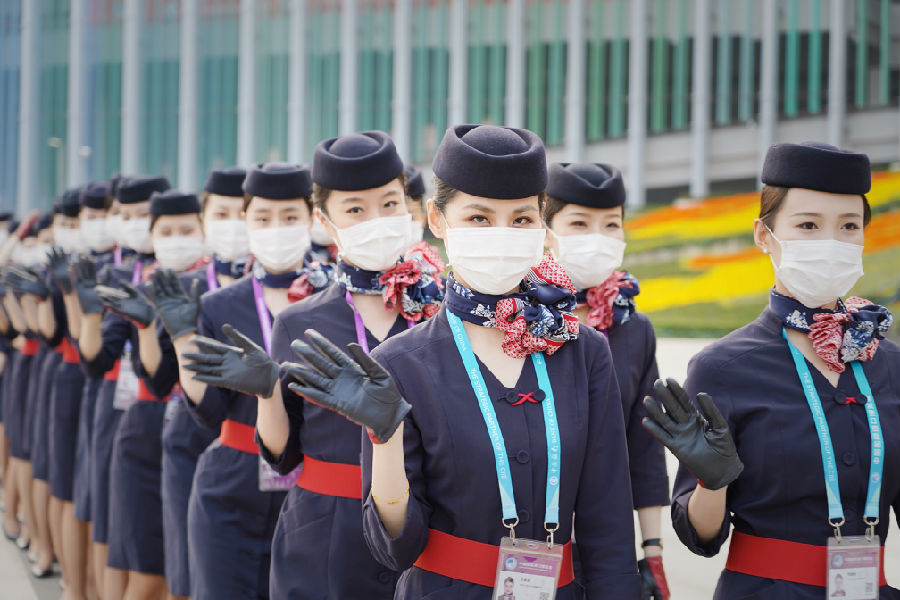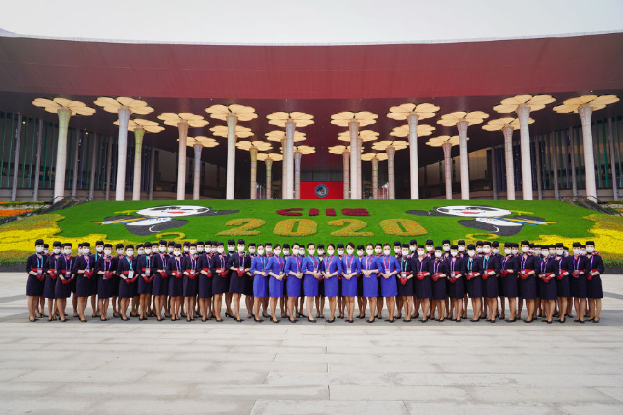 2020年11月2日,一支整齐划一的靓丽队伍出现在上海国家会展中心。在第三届中国国际进口博览会开幕前夕,70名东航凌燕礼仪志愿者齐集进博场馆,再次参与到进博会的各项服务保障工作中。在前两届进博会上,这些来自“东航凌燕礼仪志愿服务队”的乘务员以周到、细致地服务,用她们的美丽与智慧,向世界展示了东航品牌、民航精神、上海服务的魅力。