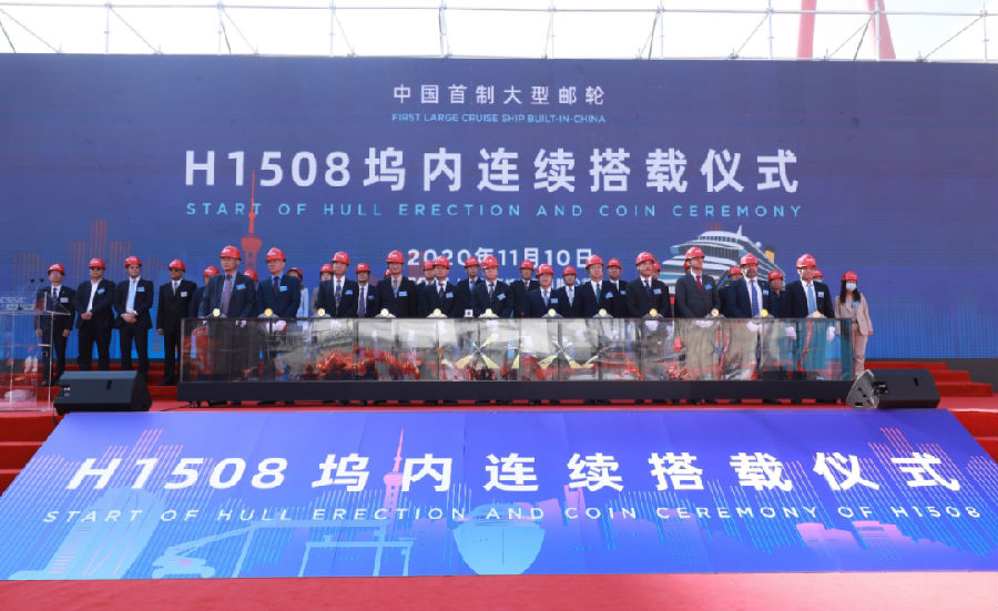 大型邮轮工程是中国船舶集团贯彻习近平总书记重要指示精神、落实国家战略、满足人民美好生活需要的重大举措,也是中国船舶集团强化科技创新、促进转型升级、推动高质量发展的一号工程。2018年11月6日,中国船舶集团与美国嘉年华集团、意大利芬坎蒂尼集团在首届中国国际进口博览会上正式签订2+4艘13.5万总吨Vista级大型邮轮建造合同,并举行了中国船舶集团大型邮轮项目工程正式启动仪式。这是我国首次签订真正意义上的大型邮轮建造合同,开启了中国船舶工业建造大型邮轮的新时代。2019年10月18日,中国首制大型邮轮在外高桥造船正式开工点火进行钢板切割,全面进入实质性建造阶段。一年多来,外高桥造船经受住了新冠肺炎疫情的考验,克服了物资采购、薄板车间流水线建设滞后等一系列困难,如期实现了坞内连续搭载总装的里程碑节点。