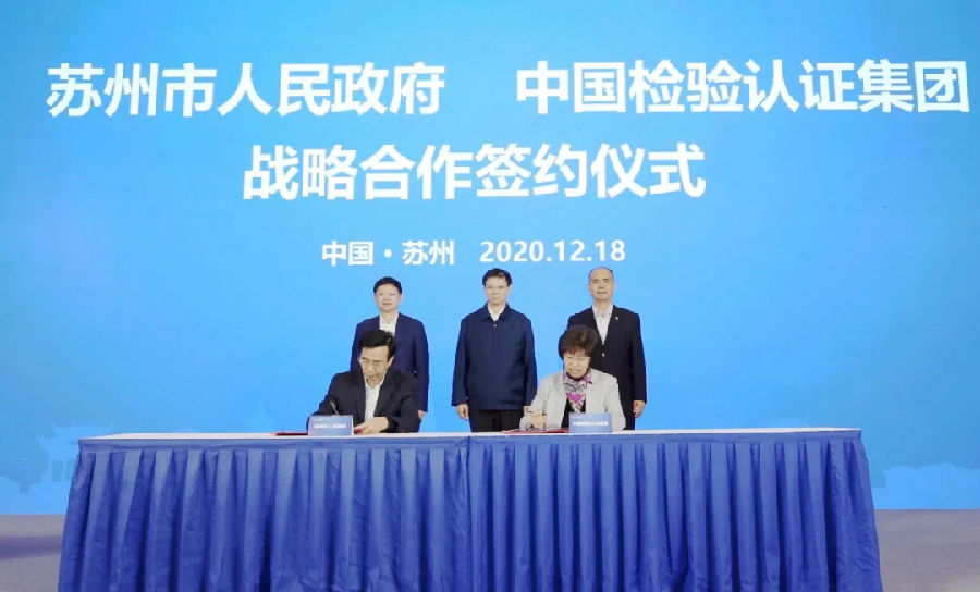 签约仪式上,王翔和陆梅签署《苏州市政府 中国检验认证集团关于加强检验检测认证领域战略合作协议书》,许昆林、许增德登台为“‘苏州制造’品牌国际认证联盟”和“苏州认证服务中心”揭牌。