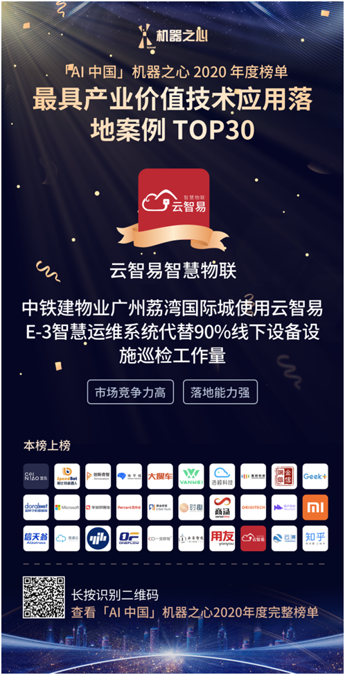 近日,前沿科技媒体和产业服务平台机器之心主办的“「AI中国」机器之心2020年度评选”揭晓,中铁建物业广州荔湾国际城智慧社区项目获评“2020最具产业价值技术应用落地案例”TOP30。