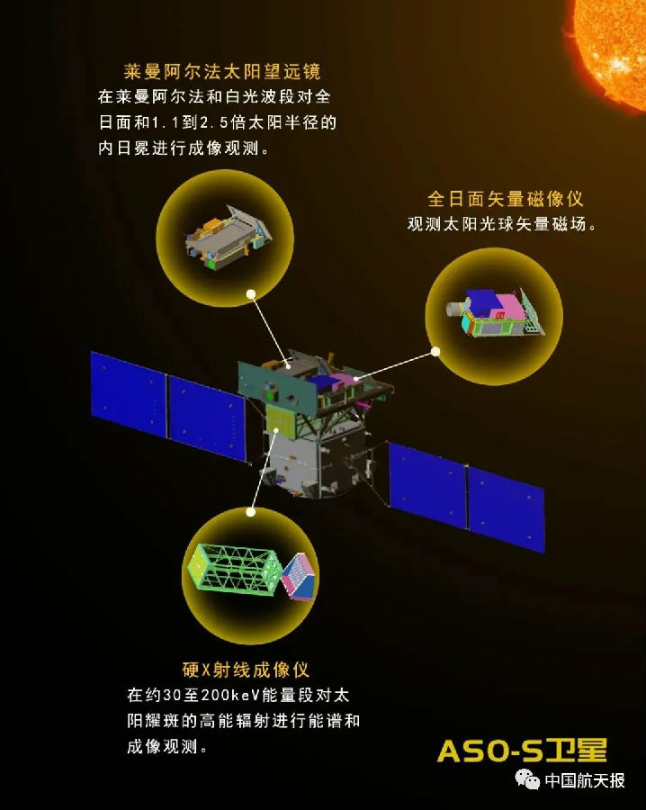 ASO-S由莱曼阿尔法太阳望远镜,全日面矢量磁像仪及硬X射线成像仪等3台有效载荷组成,将工作在距离地表720公里的地球极轨,预期在轨运行不少于4年。