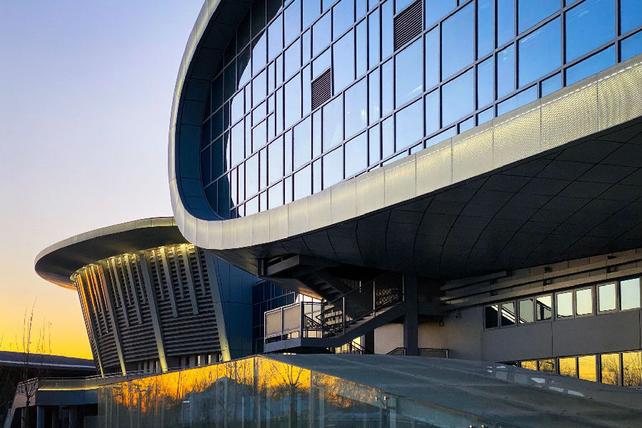 方形场馆从空中俯瞰,如同一块晶莹剔透的冰块;从外观看,其玻璃外立面就像一条条冰棱,体现着与冰雪元素的深度融合。