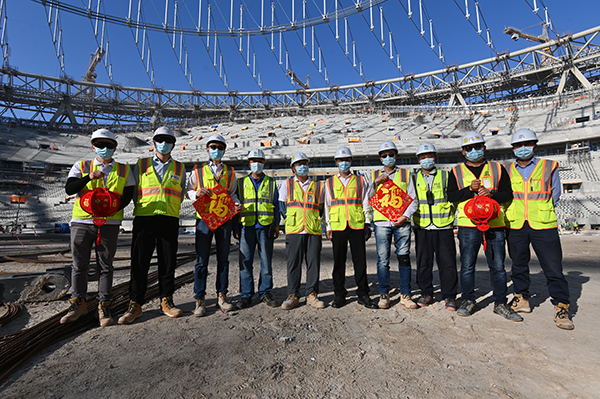 当地时间2月13日,农历正月初二,在距地面约66米的高空,中国铁建国际集团承建的2022年卡塔尔世界杯主体育场卢赛尔体育场项目总重量约2300吨的主索网张拉成形,与钢结构成功销接,标志着中国企业首次以设计施工总承包身份参建的世界杯主场馆屋面主体结构顺利完工。