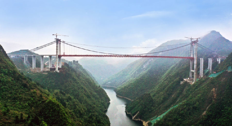 项目最大的技术亮点在于国内首次采用空中纺丝法架设主缆,主缆长1113米,包括72根通长索股和4根背索,由24128根高强镀锌钢丝组成,总重量近4600吨。不同于常规的预制平行索股法施工工艺,空中纺丝法利用牵引机械往复拽拉高强镀锌钢丝,在现场制作平行钢丝索股。该技术的成功应用不仅填补了国内技术空白,而且为行业制定主缆空中纺丝法技术标准提供了参考。