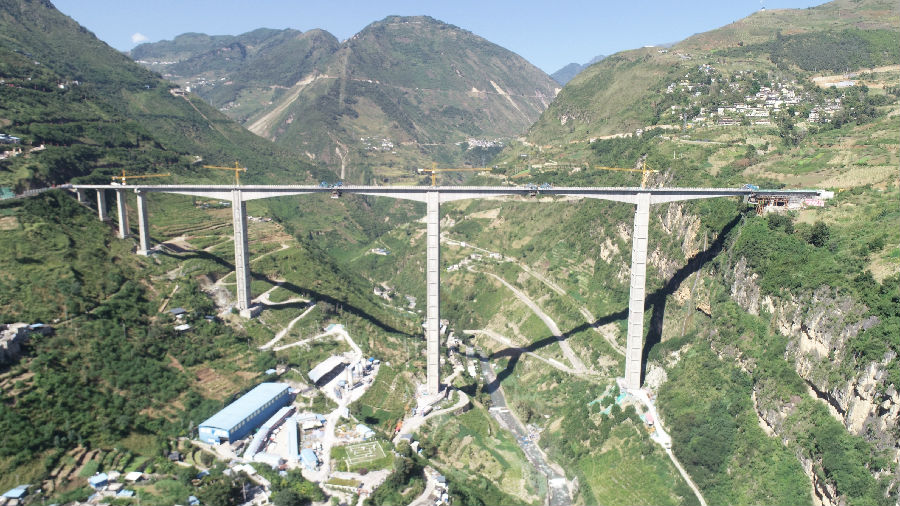 国庆期间,具有“世界第一高钢管混凝土格构空心桥墩”的金阳河特大桥顺利合龙,该桥计划于本年度12月建成通车。
