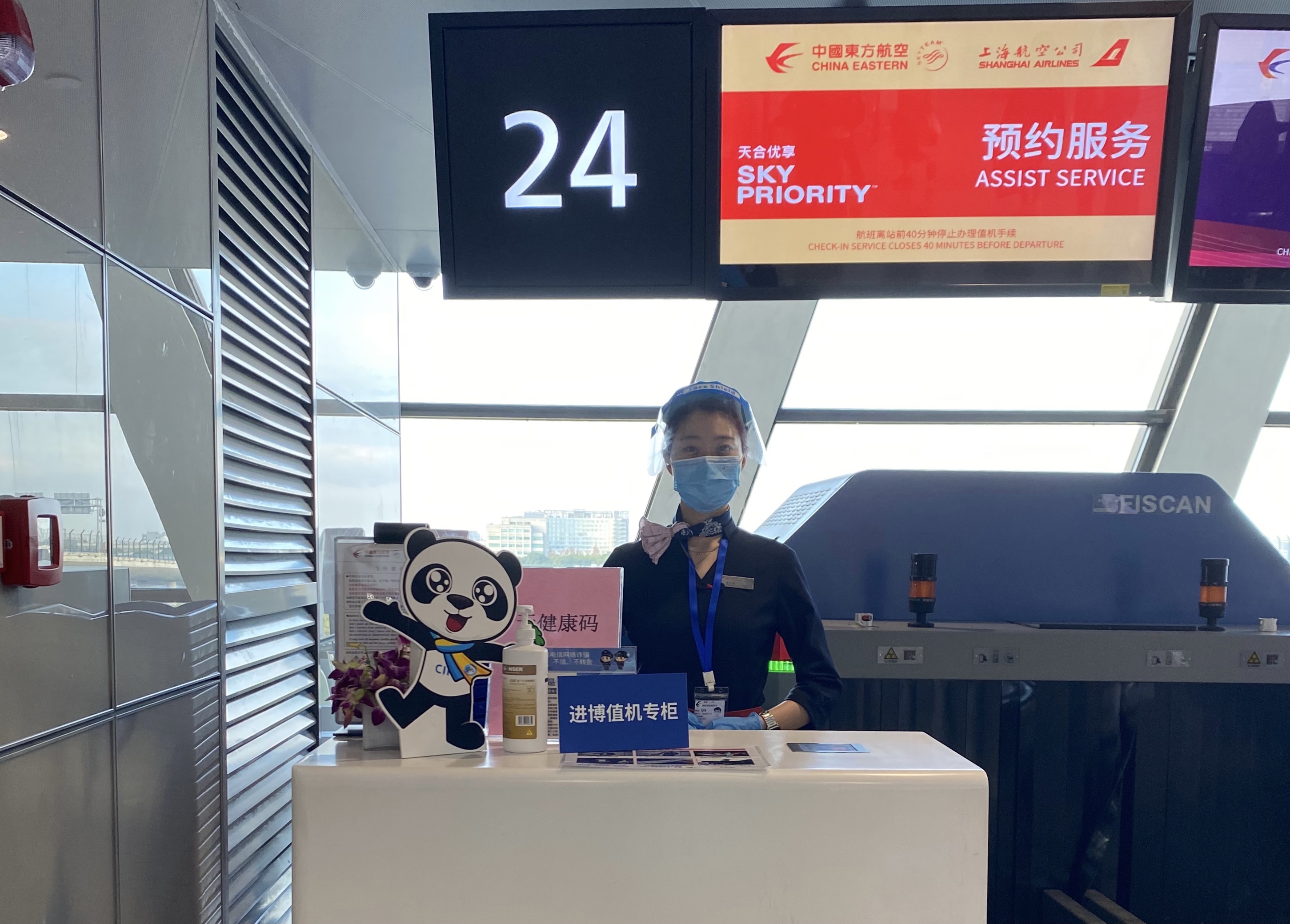 在上海虹桥国际机场、上海浦东国际机场,东航精心挑选政治素养高、业务能力强的地面服务人员,成立“进博会专项保障小组”;并将浦东机场国际D2柜台、国内A24/319柜台设置为“进博会值机专柜”,将中转厅T区国际7号柜台、国内1号柜台设置为“进博服务专柜”。旅客可通过柜台摆放的进宝、进博号、进博台旗等醒目标识快速搜索识别,获取东航地服人员的协助服务,办理值机、中转、问询、客票服务等一系列航空服务。