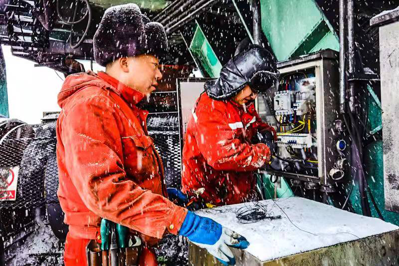 图为国家能源集团准能集团哈尔乌素露天煤矿的电工冒雪检修设备