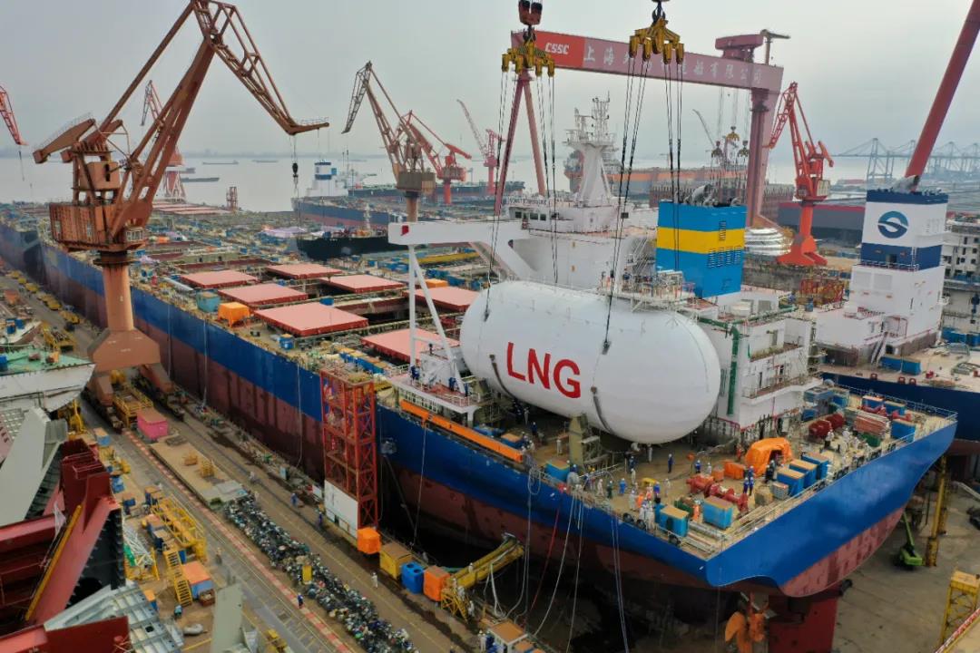 “碧玺山”号是外高桥造船自主研发设计的新一代具有自主知识产权的双燃料动力船型,船型长299.50米,型宽50米,型深25.20米,设计吃水18.40米,设计吃水航速14节,入级美国船级社。在当前碳达峰、碳中和背景下,液化天然气(LNG)因市场供应成熟、经济性好等因素,是现阶段最佳替代燃料的主要选择。