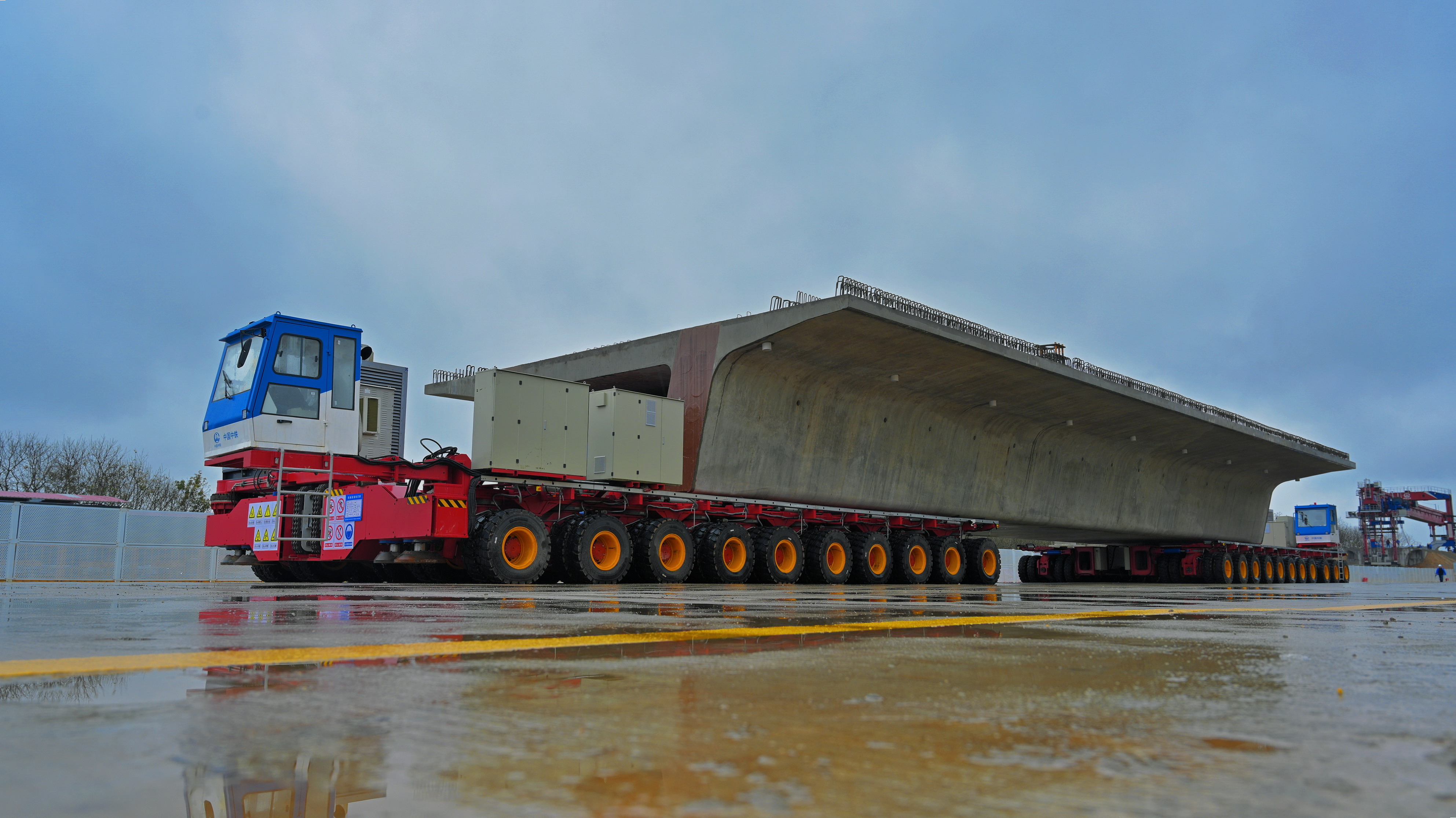 “陆吾号”由1000吨单主梁架桥机和分体式运梁车组成。该架桥机是目前国内首台轮胎驱动过孔走行一次纵移到位的双模式单主梁架桥机。设备能够快速便捷地实现40米和32米跨度箱梁架设,工况适应能力强。项目负责人李珍西介绍:“架桥机自动化程度高,依赖人工安装部件的作业由6项减少到1项。”