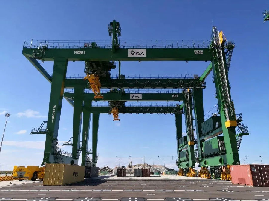 新加坡大士港自动化码头项目是集港口航运、临港工业、造船业及其他港口事业为一体的超级港口综合体,此次完成生产、建造、发运的设备包括20台双小车自动化岸桥和56台自动化轨道吊。振华重工通过多项关键技术创新,实现了双小车自动化岸桥在智能化、高效化的升级换代。轨道吊兼具辅助控制系统(ASC)功能则采用了当前最先进的控制技术和设计方案,具备较高的整机性能与动刚度,实现轨道吊在堆场端部的交换区具备对外集卡的自动化作业能力。