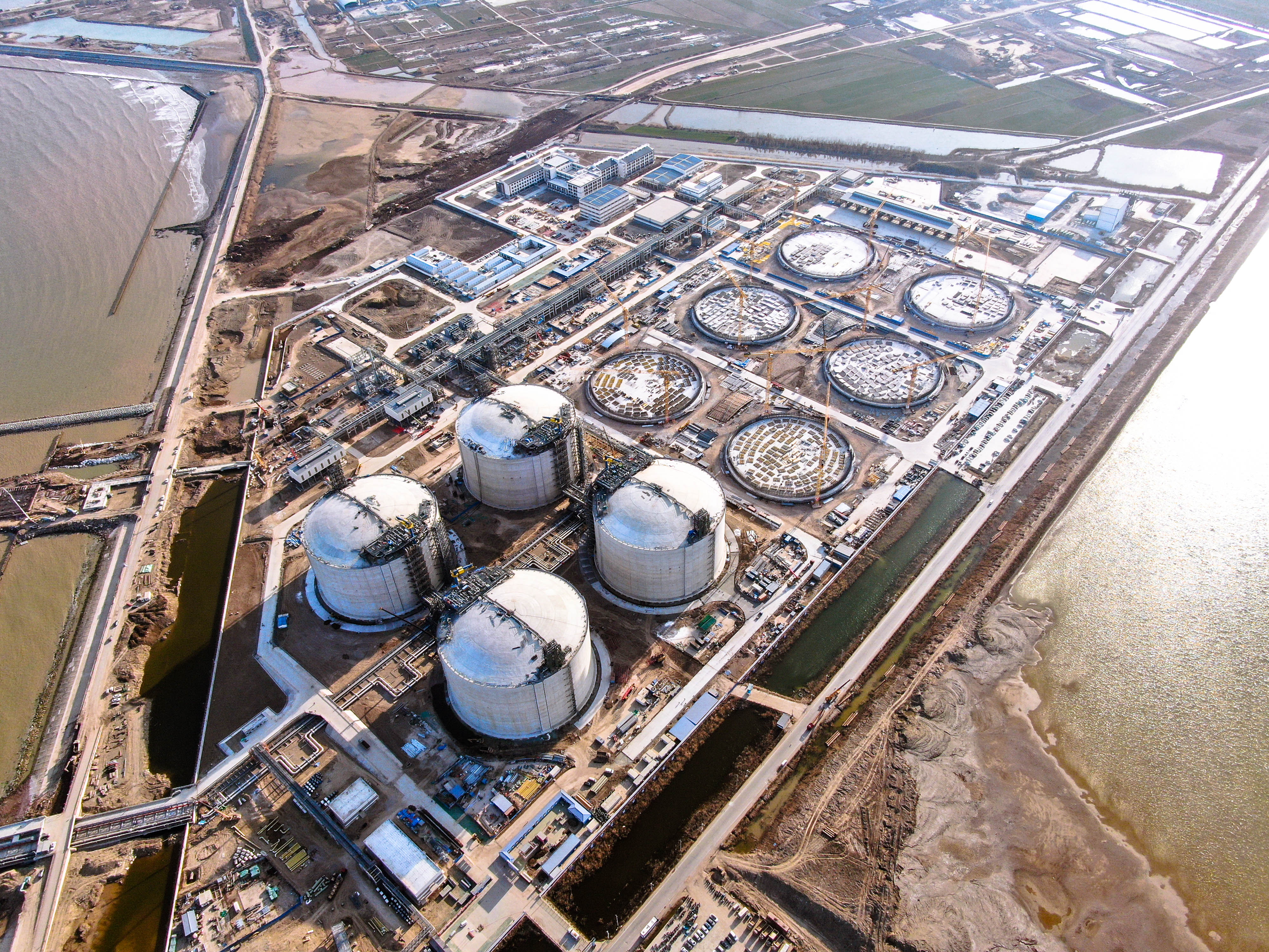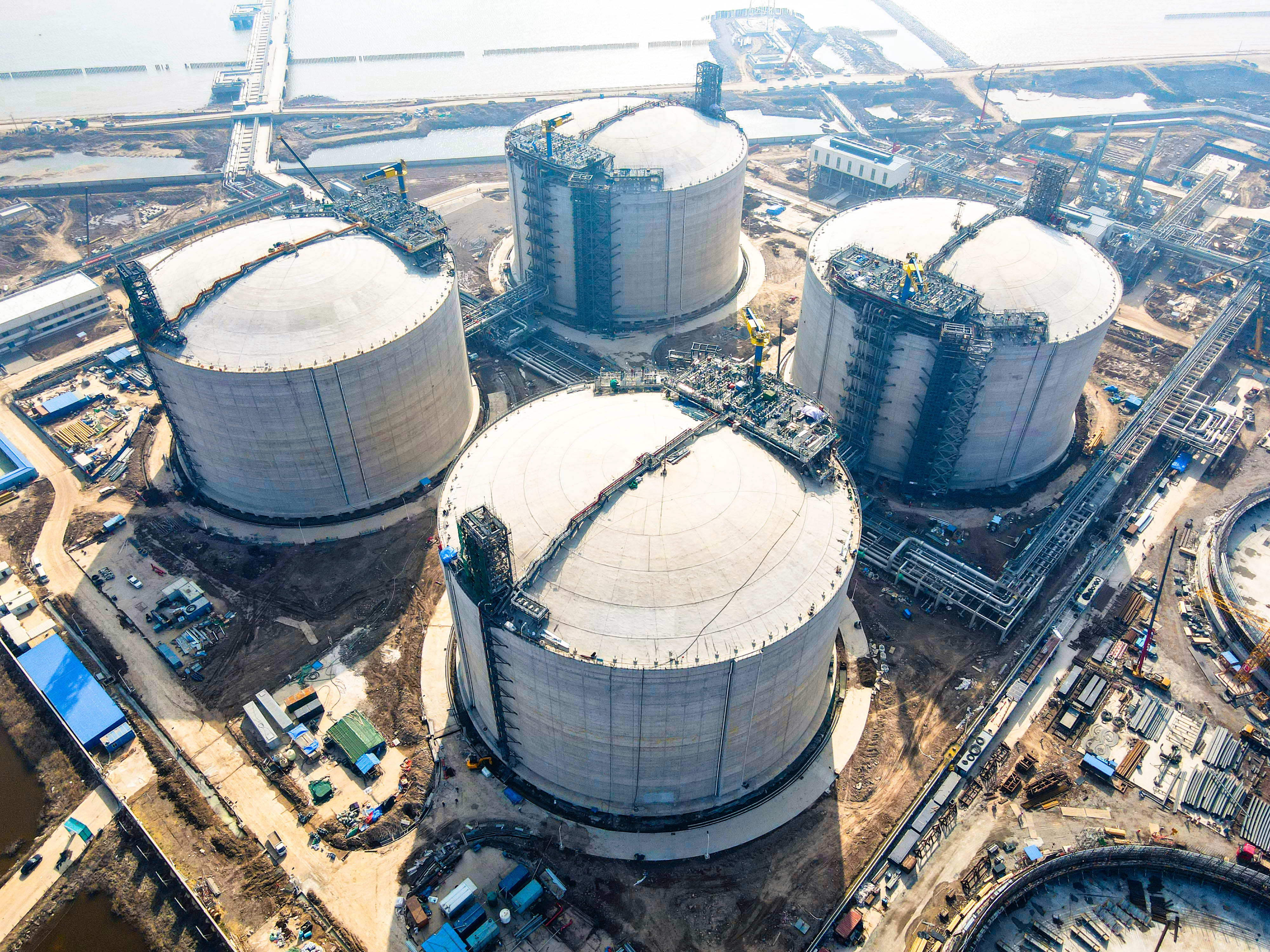 3月25日,由我国自主设计建造的4座22万方LNG储罐施工完成。
