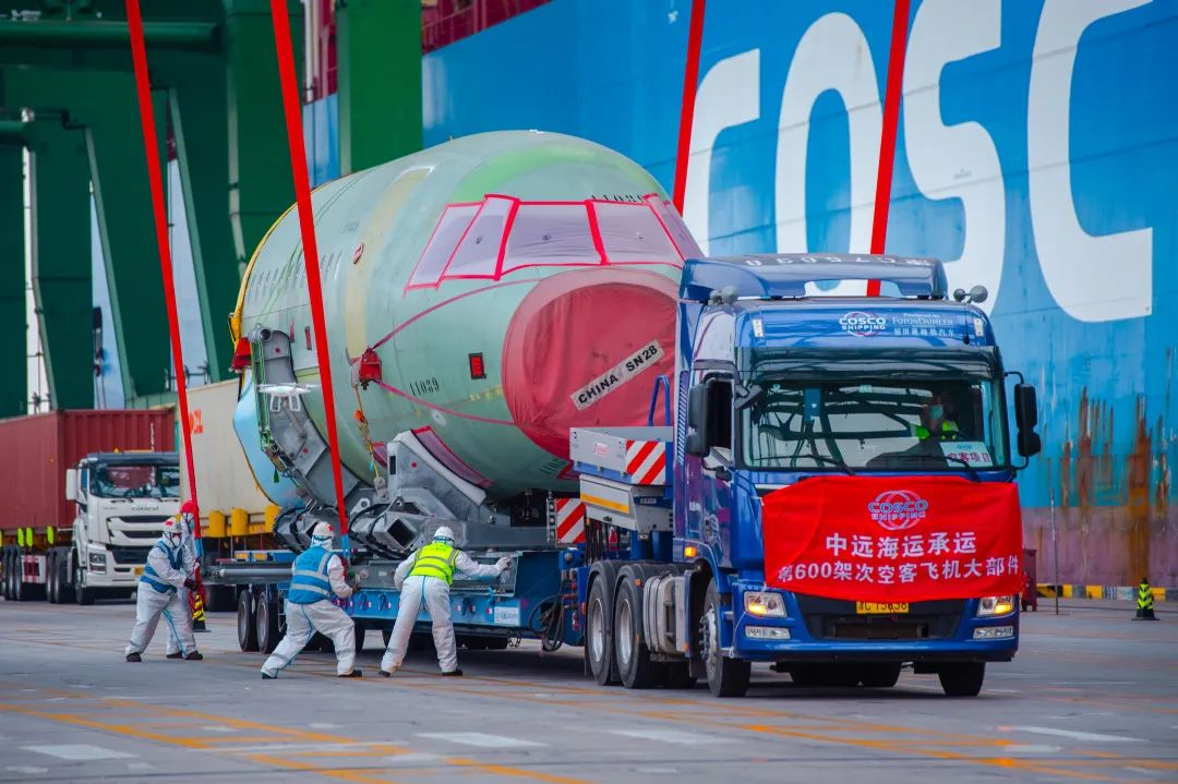 4月25日,由中远海运提供全程物流运输服务的空客亚洲总装线项目第600架次A320飞机大部件,历经欧洲段驳运、海运、天津段全封闭陆路运输,顺利运抵空客公司位于天津港保税区的空客总装厂并圆满交付。