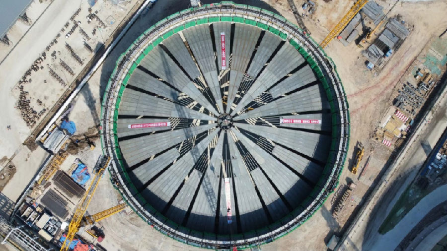 中核五公司承建的江苏滨海LNG一期扩建项目9号、10号LNG储罐是目前国内在建规模最大的液化天然气储备基地——中国海油盐城“绿能港”的重要组成部分,这两座27万立方LNG储罐是目前全球自主设计建造的最大的LNG储罐,单台储罐拱顶呈球冠形,半径90米,重约819吨,为方便安装,将拱顶划分成12个大拱顶块和12个小拱顶块进行预制。本次吊装历时11天,该项目储罐拱顶模块的成功吊装刷新了全球最大单体LNG储罐的拱顶吊装的记录。