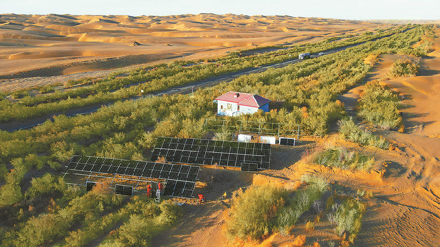 塔里木沙漠公路光伏发电站总装机规模3540千瓦,年发电量362万千瓦时,产生的电力可满足436公里生态防护林每日灌溉所需。据测算,生态防护林每年能吸收二氧化碳约2万吨,负碳部分可中和过往车辆碳排放,为我国荒漠治理和沙漠公路运行维护提供了“塔里木方案”。