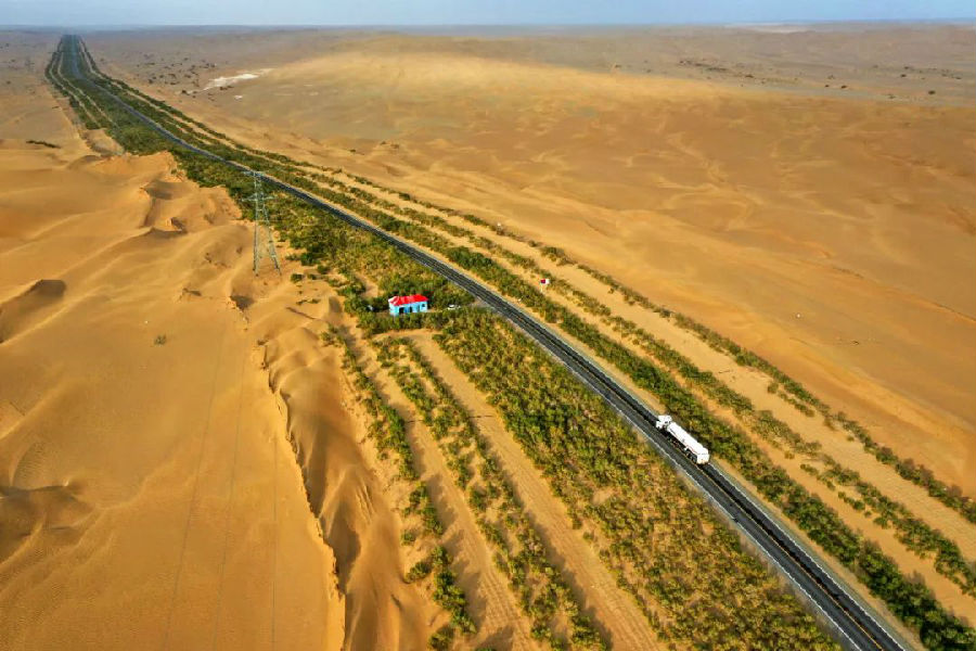 塔里木沙漠公路建成于1995年,全长566公里,是世界上贯穿流动性沙漠最长的等级公路。为抵御风沙侵袭,2006年,塔里木油田在公路沿线建成绵延436公里的生态防护林工程。