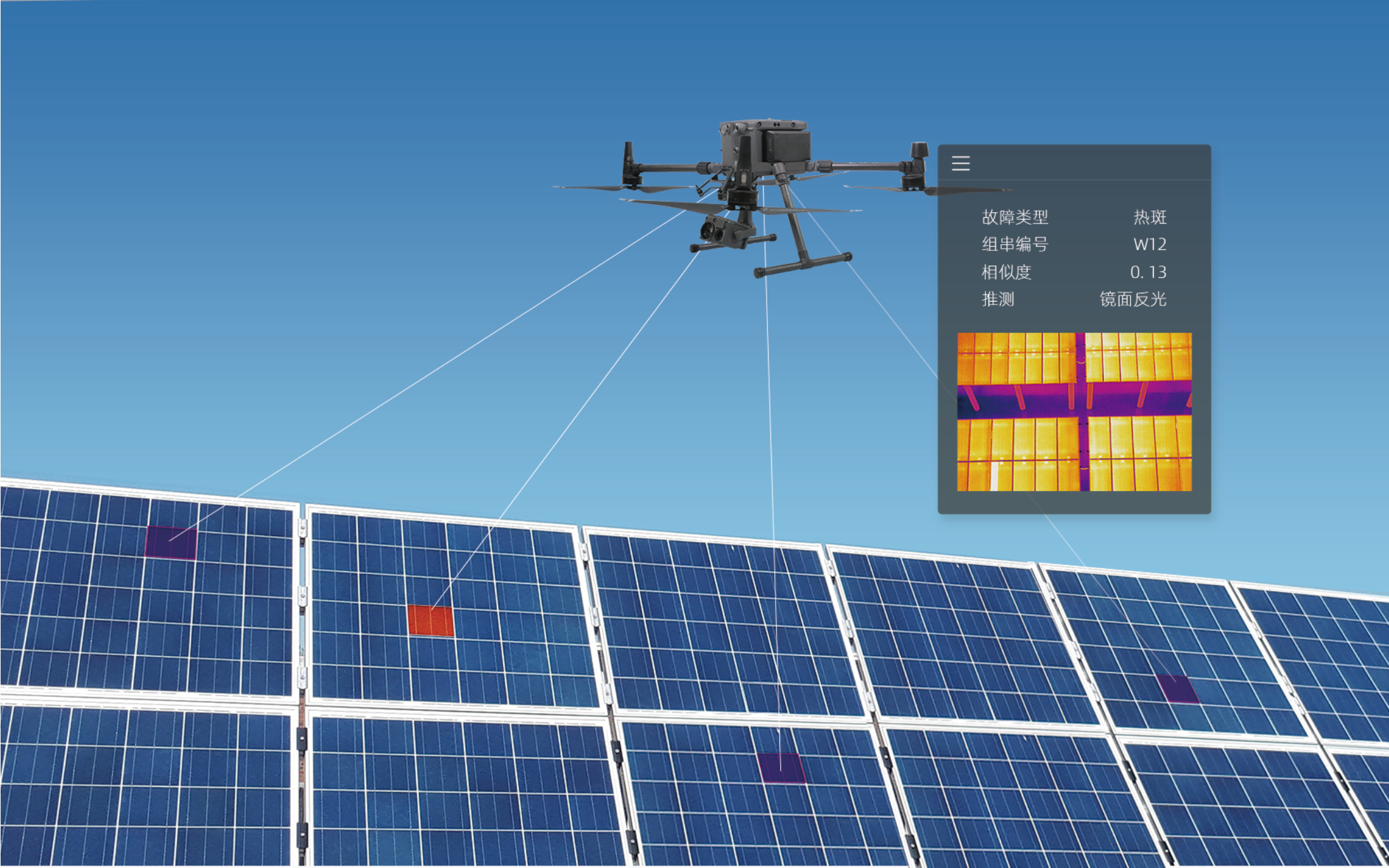 通过无人机对光伏组件巡检开展日常巡视、故障查找等工作,全面排查全场设备安全隐患,确保设备在高温天气、大负荷生产的关键时刻正常运行,全力保障迎峰度夏期间光伏场区安全可靠的电力供应,助力运维管理提质增效。
