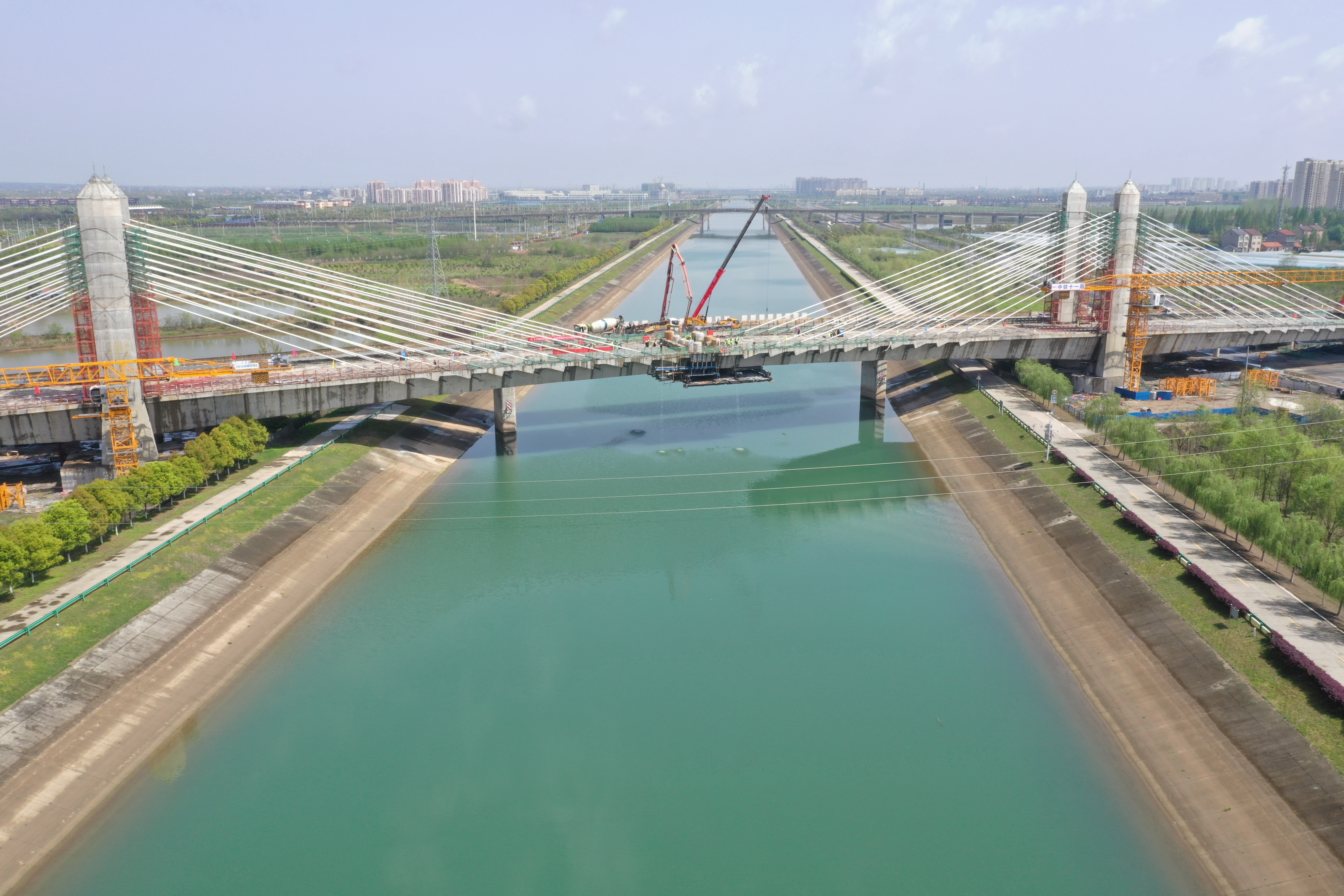 运河之上,新桥与老桥桥面、桥底基本齐平,巨大的桥墩矗立在河堤之外,桥上矮塔用40根拉索紧紧拽住桥面,大桥一跨过河。中铁十一局荆州建养一体化项目负责人介绍,该桥采用矮塔斜拉桥设计,可以避免堤内建墩,也不会对运河抗渗性和正常通航产生影响。