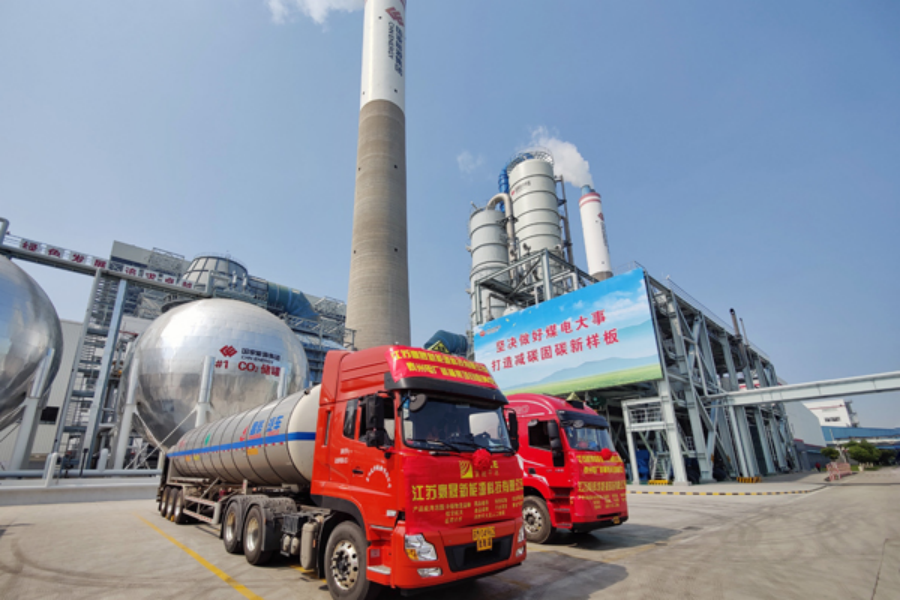 6月2日,国家能源集团江苏泰州电厂 CCUS项目正式投产,装满液态二氧化碳的罐车蓄势待发。该项目捕集到的二氧化碳通过槽车运往用户。