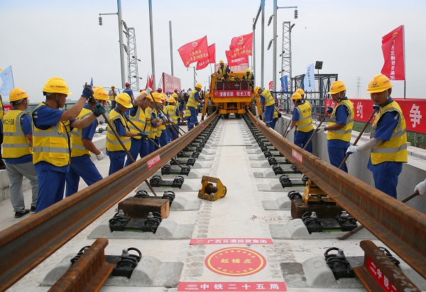 南深高铁南玉段是广西首条自主投资建设的时速为350公里的高速铁路,西起南宁东站,东止玉林北站,正线全长193.31公里,为南宁至深圳铁路的重要组成部分。此次铺轨任务由中铁二十五局承担,正线双线总长375.27公里,包含无砟轨道373.87公里,有砟轨道1.40公里,自学冲村特大桥向玉林方向铺设,沿线多次跨越既有铁路、公路、航道,具有作业精度要求高、施工干扰大、铺轨工期紧张等特点。