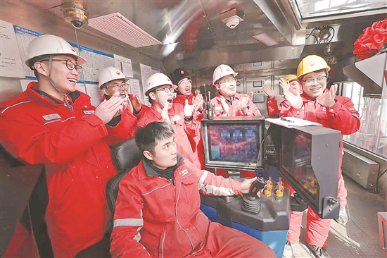 深地塔科1井钻探深度突破10000米时,司钻房内的技术人员激动地欢呼,鼓掌庆祝。