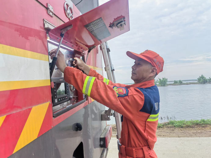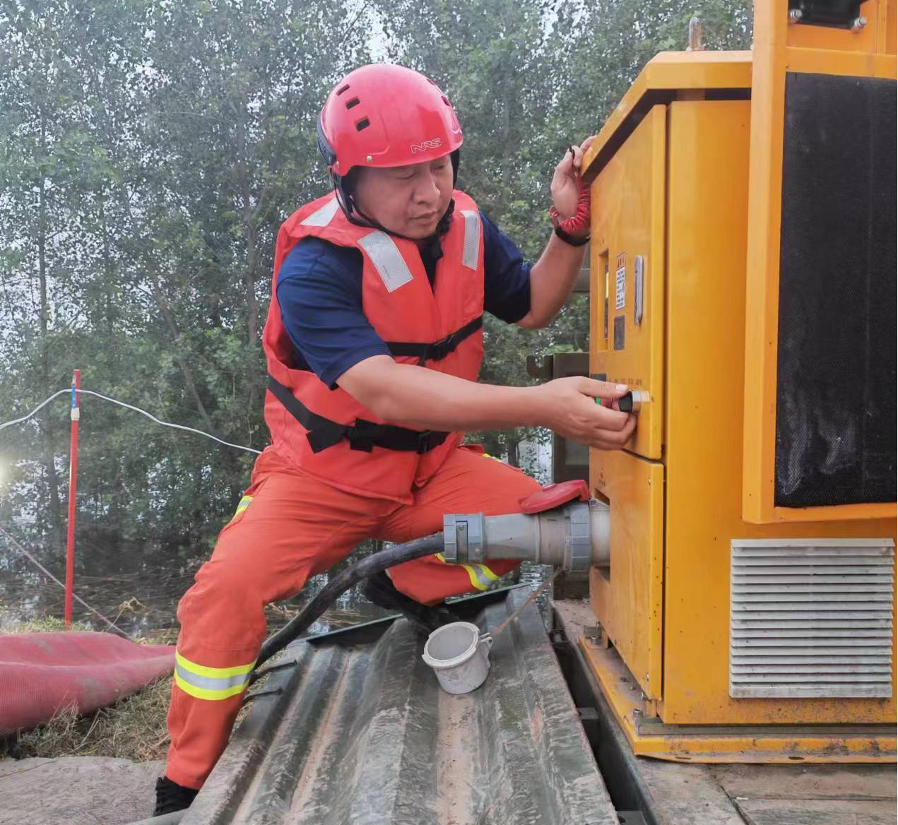 排涝现场执行两班倒导,他完成班次后仍不回驻地休息,坚持和年轻的队员们并肩战斗,一同巡检、一同给设备加油,吃住在现场,只为洪水快速散去,灾民重建家园。