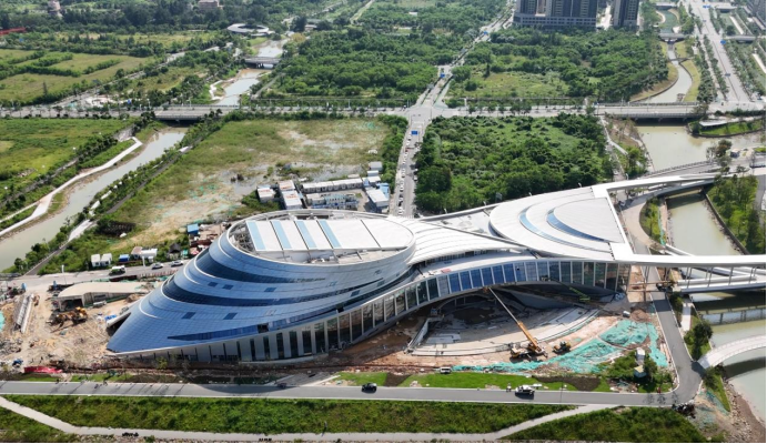 文化中心的外形设计充分借鉴所处地区特质,融合DNA链、海浪特色元素,科技感十足的弧形设计随处可见。建筑的“高颜值”得益于建筑艺术与技术的加持,灵动扭转的设计需通过复杂结构的马鞍形卷积双曲面幕墙和螺旋金属幕墙来实现,为施工带来了挑战。据项目总工程师王安介绍,整体造型不规则的曲面幕墙,需要考虑每一块面板的形状、曲度贴合龙骨的结构,就像拼图一样,每一个零件都要安置在专属位置。项目团队深度应用数字建造技术,逆向建模、深化设计、模拟安装轨迹,把问题解决在了前端,保证了幕墙施工的进度和质量。
