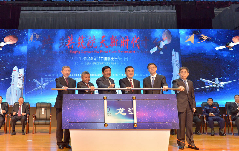 工业和信息化部部长苗圩、黑龙江省委书记张庆伟出席主场活动开幕式。国防科工局党组副书记、副局长张克俭为哈尔滨工业大学授“中国航天日”旗帜。国防科工局副局长、国家航天局副局长吴艳华主持开幕式。