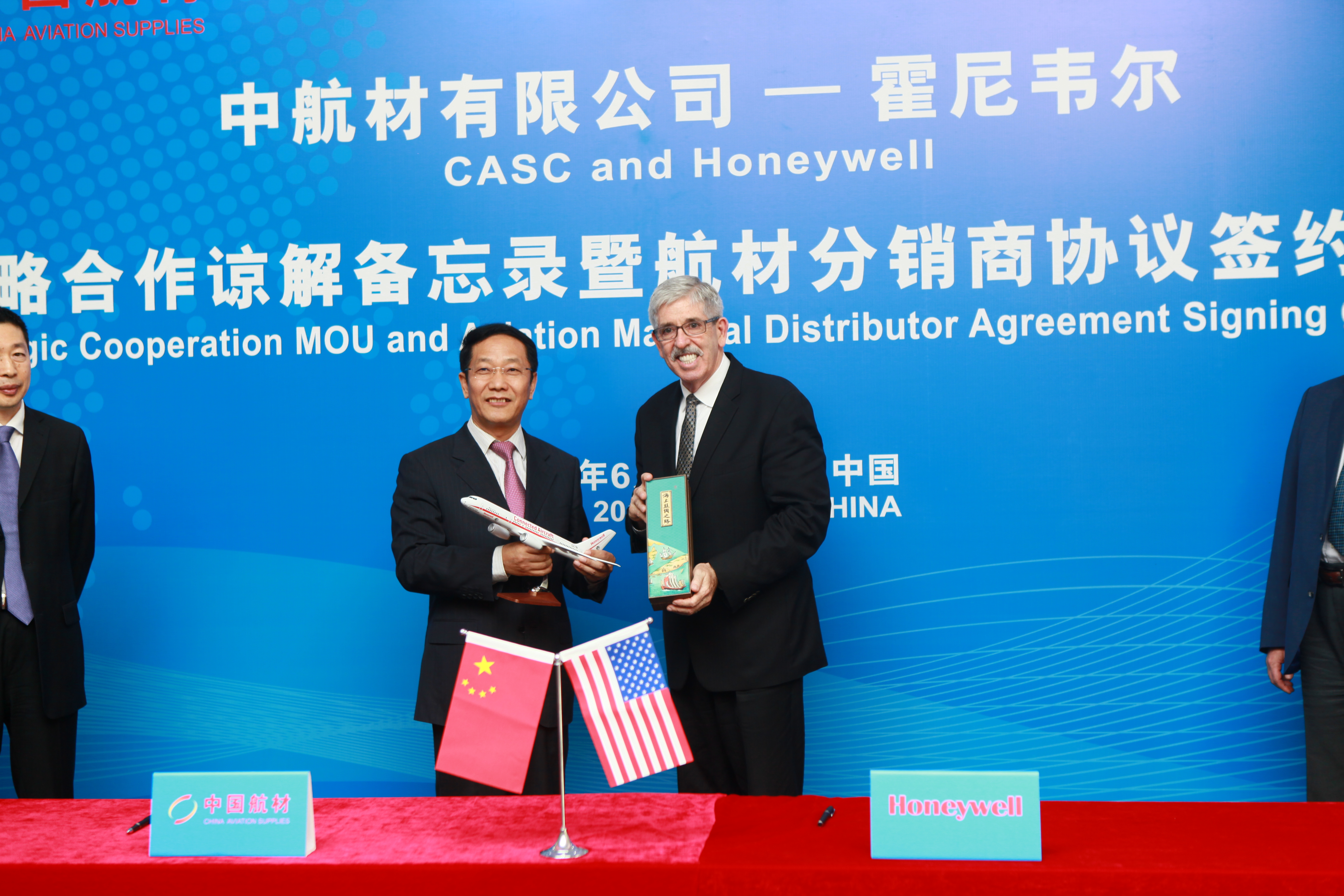 中国航空器材集团有限公司(以下简称“中国航材”)所属中国航空器材有限责任公司(以下简称“中航材有限公司”)2018年6月5日与霍尼韦尔航空航天集团(以下简称“霍尼韦尔”)在京签署了战略合作备忘录及航材分销商协议,旨在为航空公司用户提供备件支援、批量加改装等航材保障服务,共建航材保障体系。