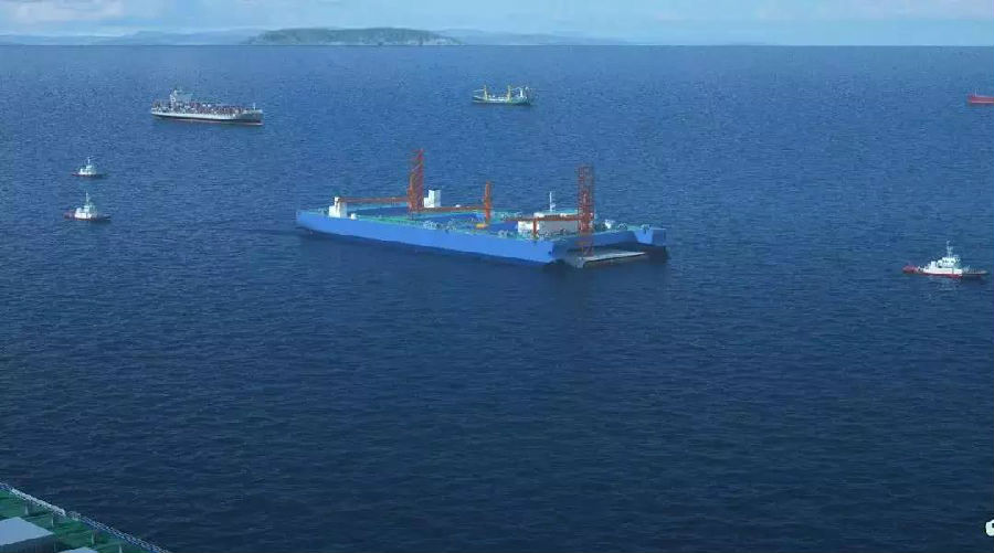 一体船主船体采用双体船船型设计,两侧片体由四个箱型跨梁连接而成,船长190.4米、宽75米、型深14.7米,片体宽9.1米;配有2套9280 千瓦主推进系统,具备自航功能,载标准沉管深水静水航速可达5节;配备8台大功率侧推,具备DP-1动力定位功能,载标准沉管深水航行工况下可抵抗1.6节横流;具备航迹追踪及自动纠偏功能,循迹宽度可控制在85米以内。