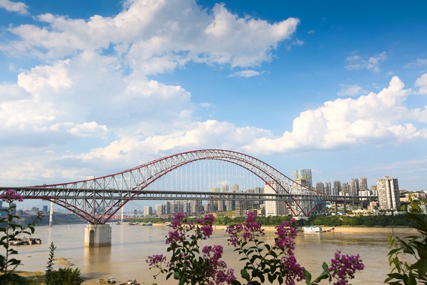 朝天门长江大桥西连江北五里店,东接南岸弹子石,是重庆轨道环线的重要组成部分。该桥为主跨552米的公轨两用钢桁架中承式特大型拱桥,是世界上跨径最大的钢拱桥。桥体分为上下两层,上层为2009年开通的公路交通,下层为预留轨道环线通行空间。