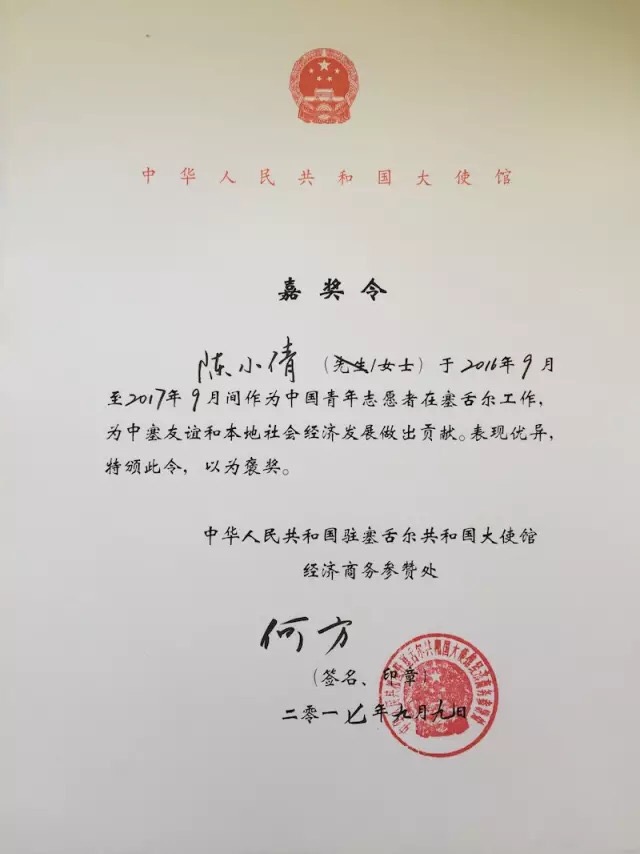 中华人民共和国驻塞舌尔共和国大使馆为陈小倩颁发的嘉奖令