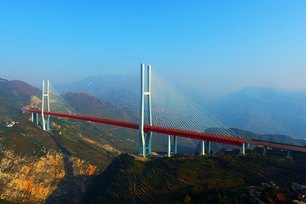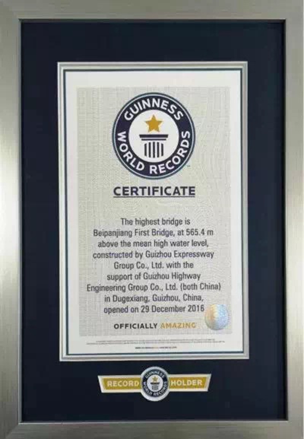 近日,杭瑞高速毕都北盘江第一桥,经世界纪录认证机构——吉尼斯世界纪录有限公司认证,北盘江第一桥桥面距江面垂直高度达565.4米,荣获“世界最高桥”之称,载入世界纪录大全史册。该桥还于2018年荣获世界桥梁界“诺贝尔奖”——古斯塔夫金奖。