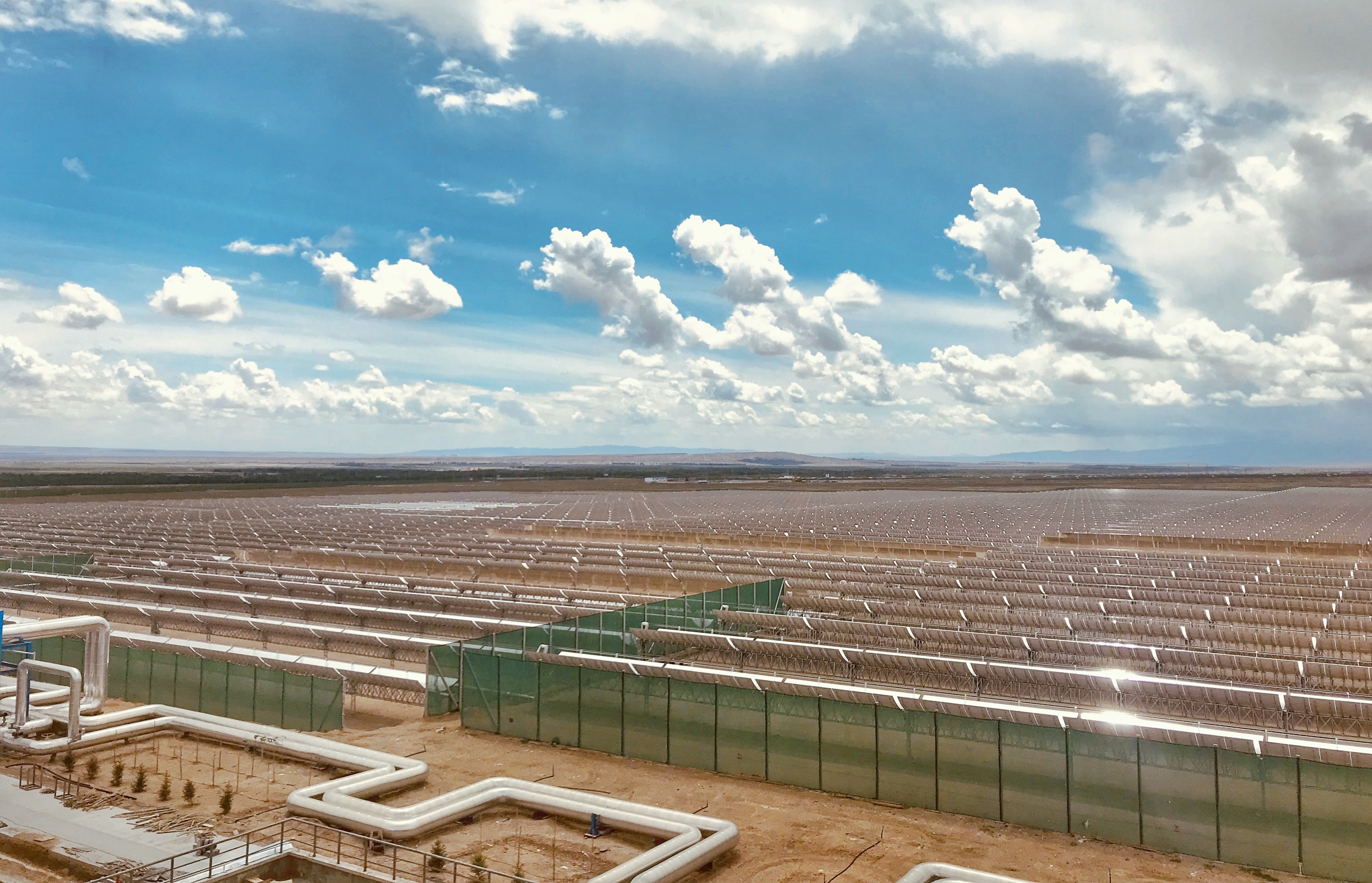 中广核德令哈光热示范项目位于青海省海西蒙古族藏族自治州德令哈市的戈壁滩上,占地2.46平方公里,相当于360多个标准足球场的面积,采用了槽式导热油集热技术路线,配套9小时熔融盐储热,由太阳岛、热传及蒸汽发生系统、储热岛、发电岛四大部分组成。