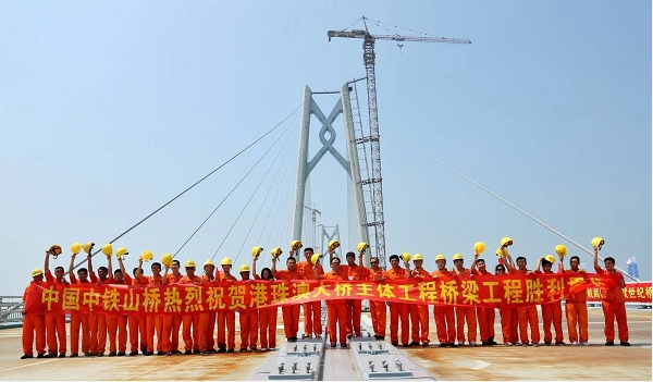 中铁山桥所承建的港珠澳大桥青州航道桥为双塔双索面钢箱梁斜拉桥,最大跨度达458米,主塔高度达163米,是港珠澳大桥跨度最大、主塔最高的通航孔桥。两座索塔为H型框架塔,索塔上横梁采用“中国结”造型。