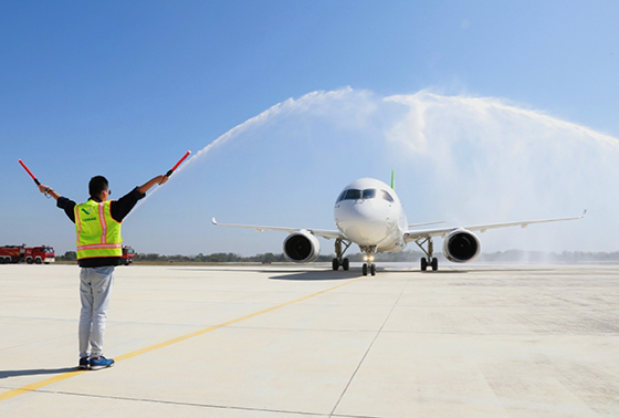C919飞机102架机通过水门