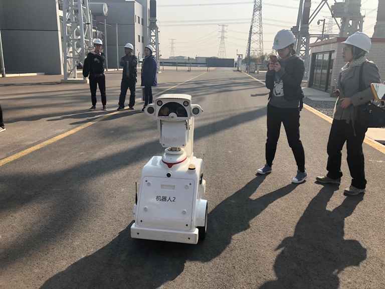 “新时代·走进新国企”采访团在国网山东电力泉城变电站采访,图为智能机器人在巡检