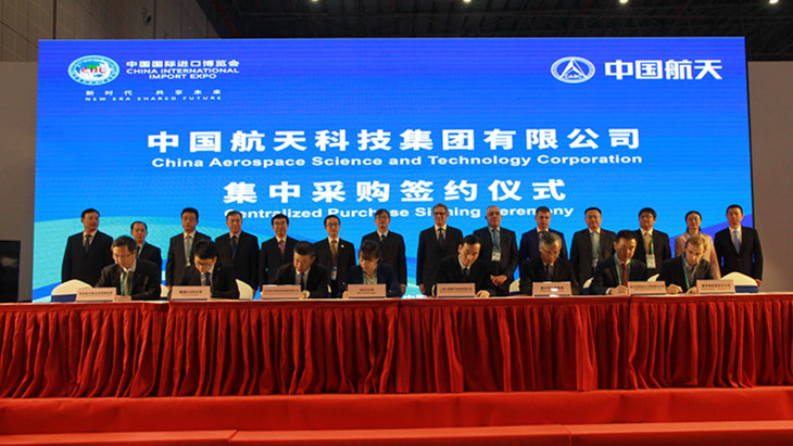 11月6日,首届中国国际进口博览会期间,中国航天科技集团有限公司举行集中采购签约仪式,集团公司所属10家企业与来自全球9个国家以及中国香港、中国台湾地区的13家企业集中签署了16个项目的采购合同或协议,全面推动中国航天与全球产业链的互动与合作。16个签约项目涵盖航空物流、新材料、先进传感、新能源、特种装备等多个领域,签约合作方为俄罗斯、美国、法国、意大利、韩国、阿联酋、日本、德国、瑞士等国企业以及中国香港、中国台湾地区企业。