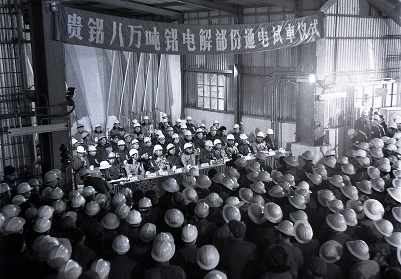 图为1981年12月18日,从国外成套引进的贵铝8万吨铝电解生产线部分通电试车