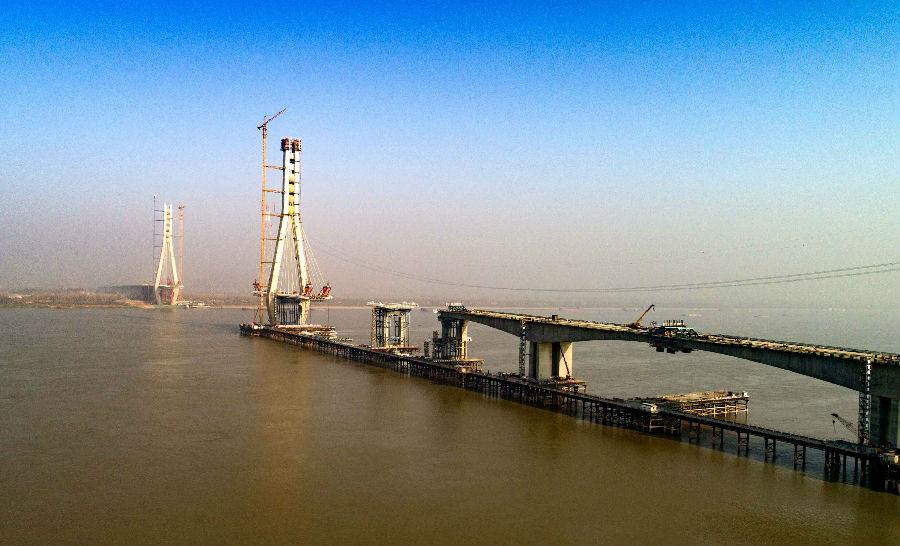中交路建承建池州长江公路大桥04合同段全长2.63公里,施工内容含主跨斜拉桥一座、连续刚构桥一座、连续梁跨堤桥一座。池州长江公路大桥跨江主通航孔桥为主跨828米不对称混合梁双塔斜拉桥,南岸主塔高243米,相当于90层楼高。施工期间,项目团队使用“新型钢横梁集聚锚”新技术,首次在塔身施工中采用“皮肤功能混凝土”,全力推进工程建设。